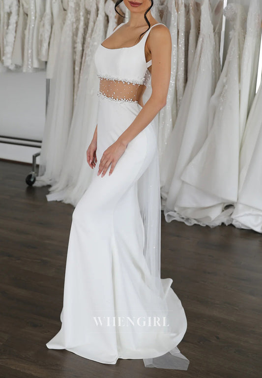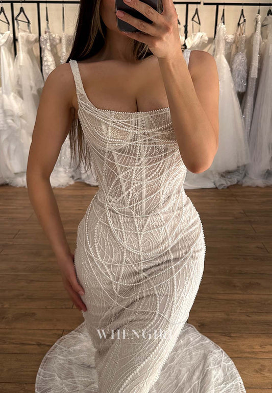 Square Neck Sleeveless Pearls Beading Tie Back Mermaid Wedding Dress