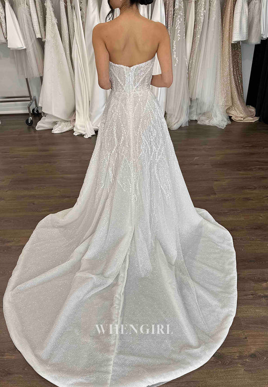 A-Line V Neck Strapless Sleeveless Side Slit Sequins Beading Court Train Wedding Dress