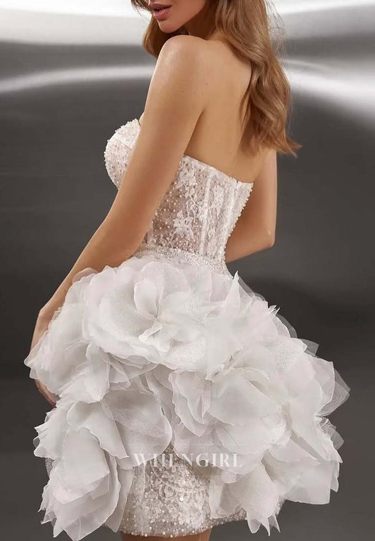 Sweetheart Sleeveless Multi Tiered Pearls Sequins Beading Sheath Short Wedding Dress