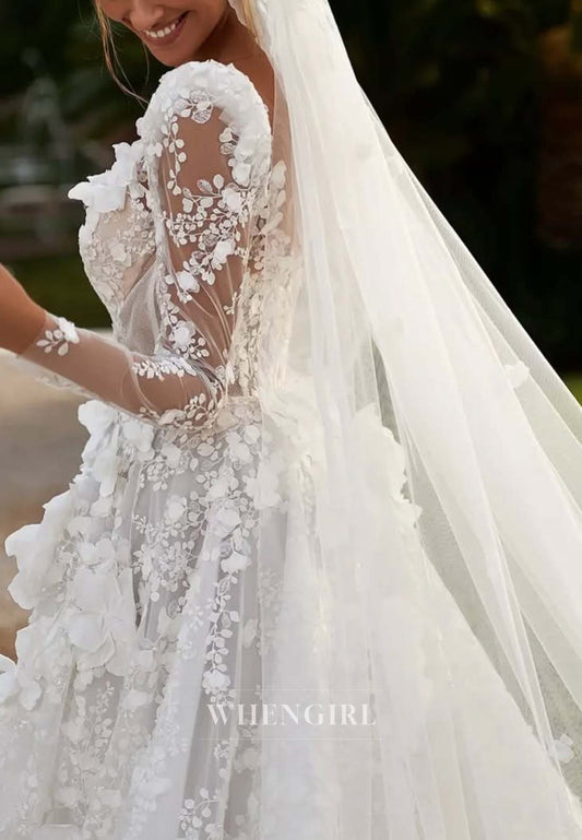 Floral V Neck Long Sleeve Appliqued Lace A-Line Sweep Train Wedding Dress