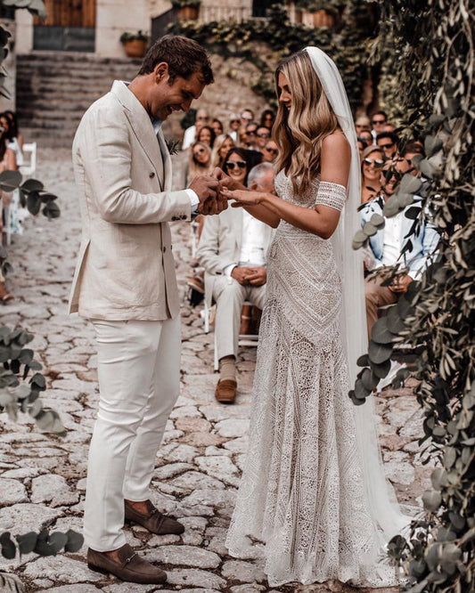 Mermaid Off-the-Shoulder Backless Ivory Lace Beach Wedding Dresses