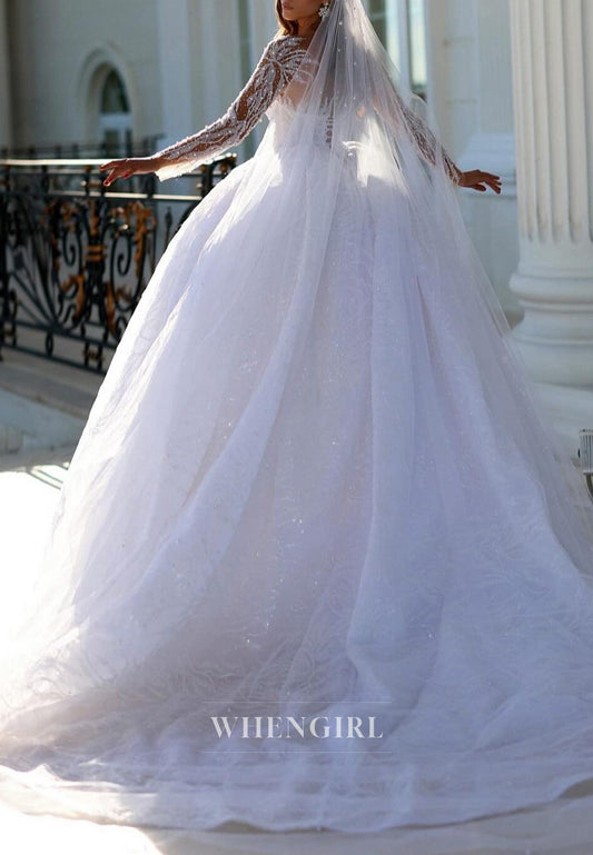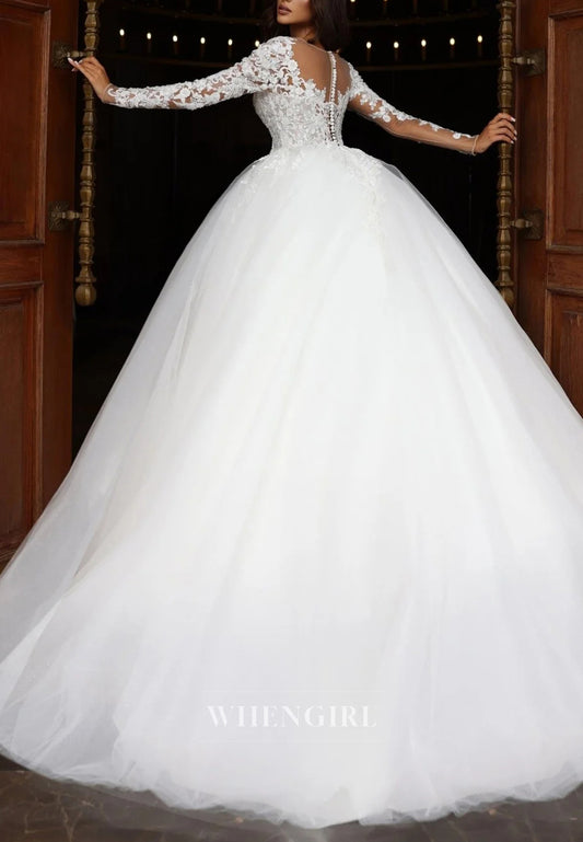 Illusion Neck Appliques Tulle Long Sleeves Ball Gown Wedding Dress with Court Train