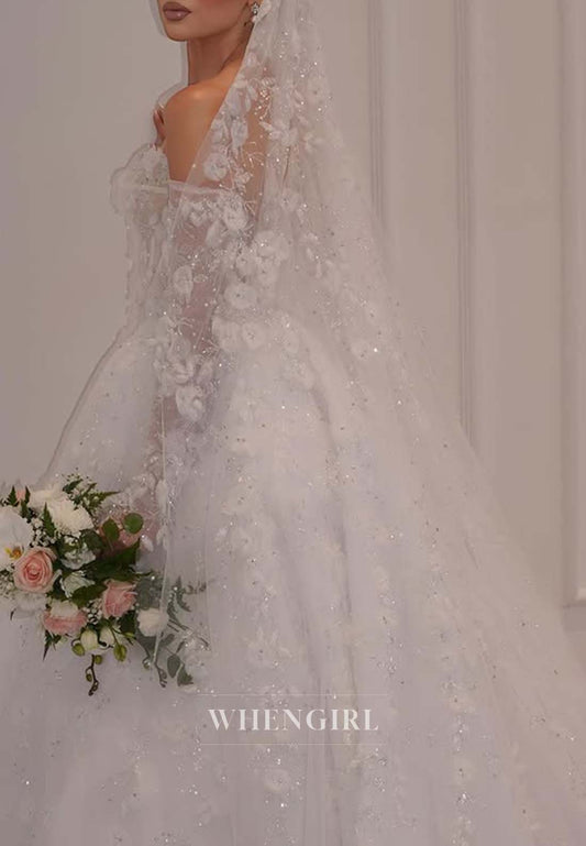 Ball Gown Sweetheart Long Sleeves Appliqued Lace Court Train Wedding Dress