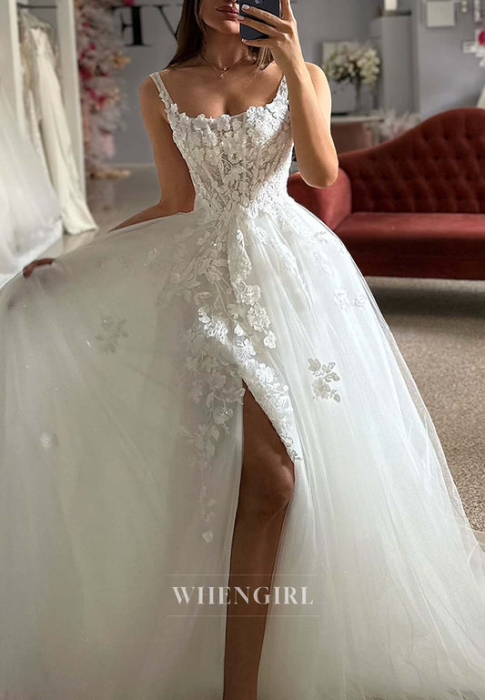 Bateau Neck Sleeveless Appliqued Tulle A-Line Side Slit Wedding Dress with Court Train