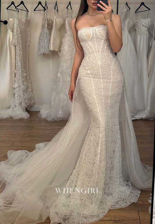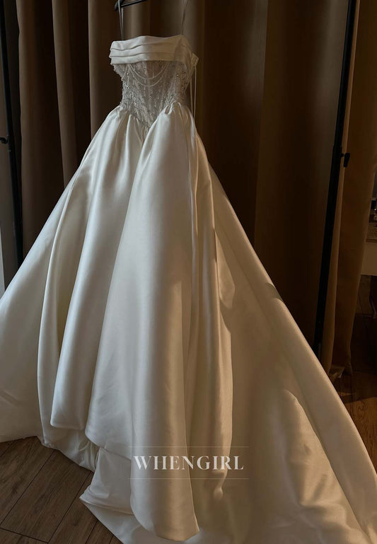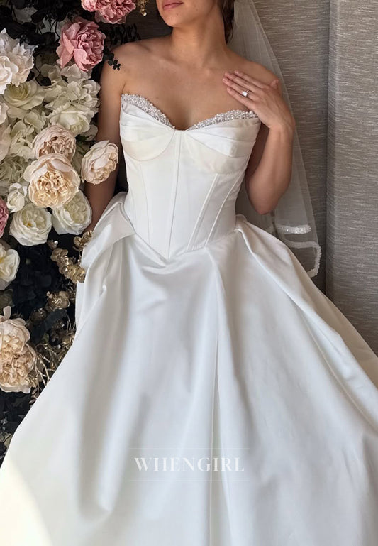 Sweep Train Strapless Pearl Sequins Graceful Ball Gown Wedding Dress
