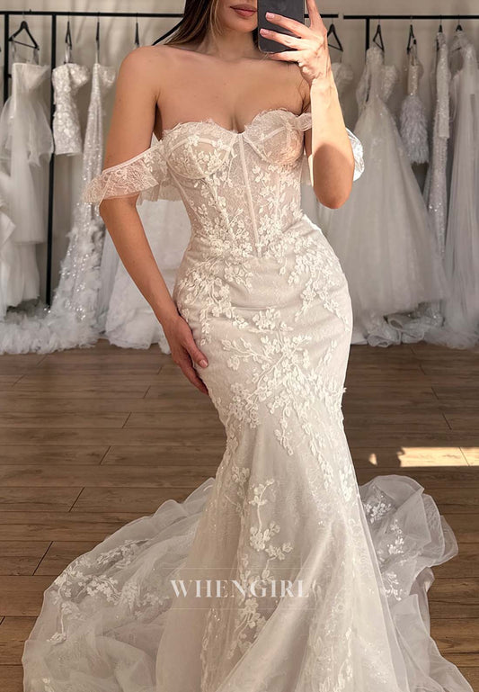 Sweetheart Off Shoulder Sleeveless Mermaid Wedding Dress with Appliques