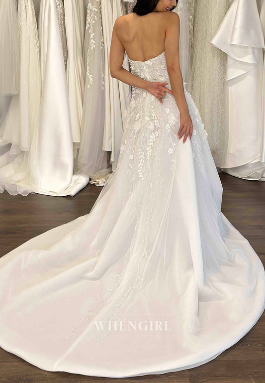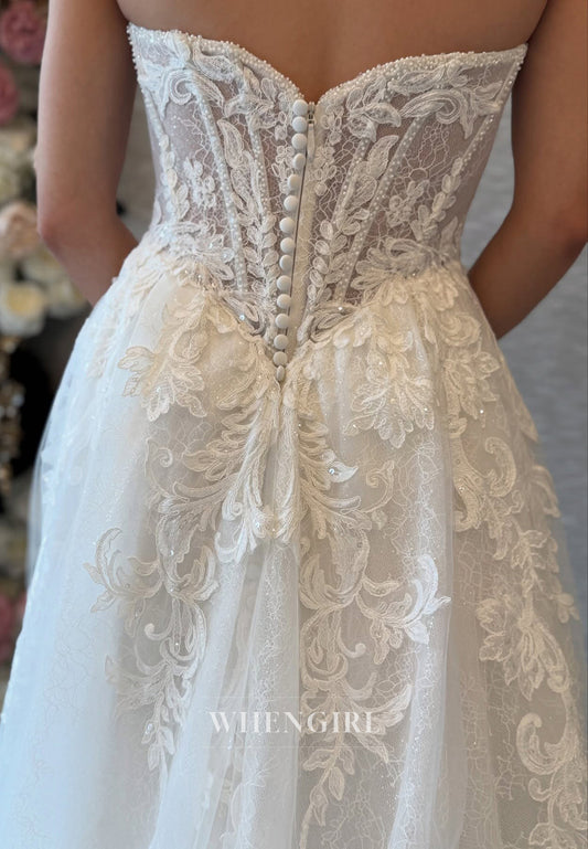 A-Line Strapless Appliqued Lace Corset Sleeveless Beaded Side Slit Wedding Dress with Chapel Train