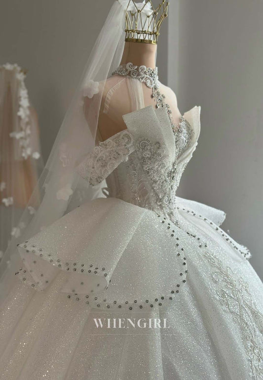 V Neck Off Shoulder Appliqued Beads A-Line Sequins Wedding Dress