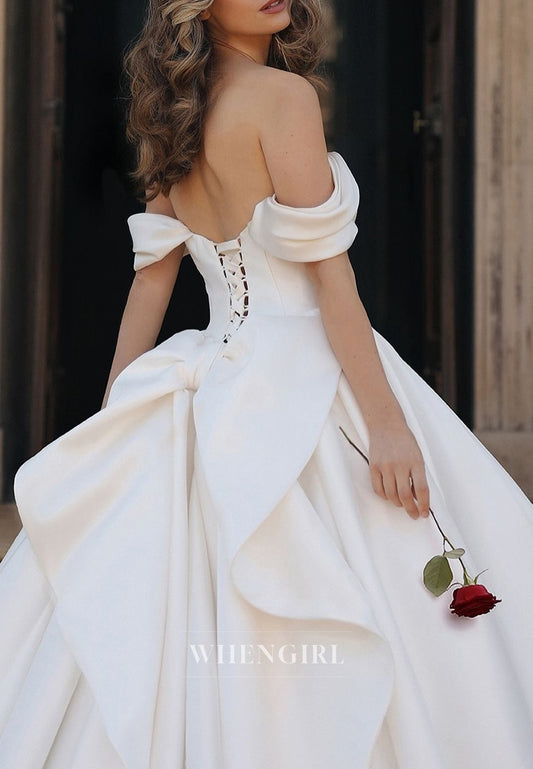A-Line Sweetheart Off Shoulder Sleeveless Satin Appliques Bowknot Chapel Train Wedding Dress