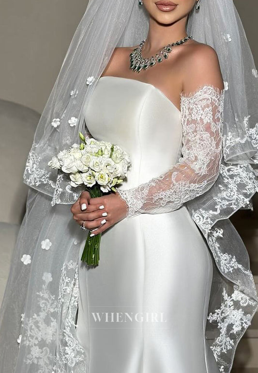 Sheath Strapless Illusion Lace Sleeves Simple Satin Wedding Dress