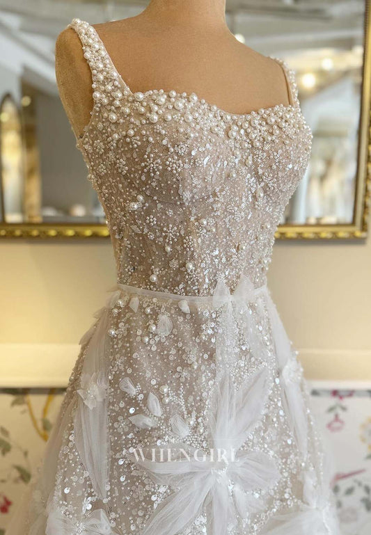 A-Line Sweetheart Sleeveless Pearls Sequins Beaded Sweep Train Wedding Dress
