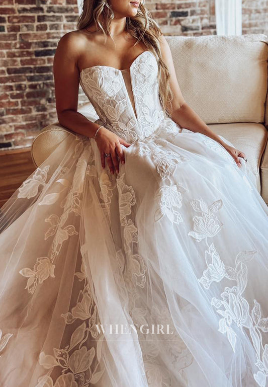 V Neck Sleeveless Appliqued Strapless Court Trian A-Line Wedding Dress