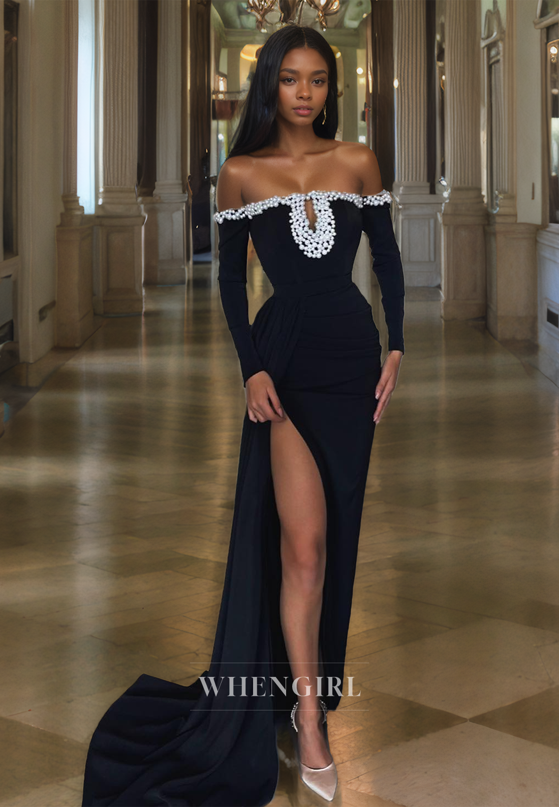 Tube Top Long Sleeves Sheath High Split Train Beads Satin Party Dress with Cut Outs Prom Dress