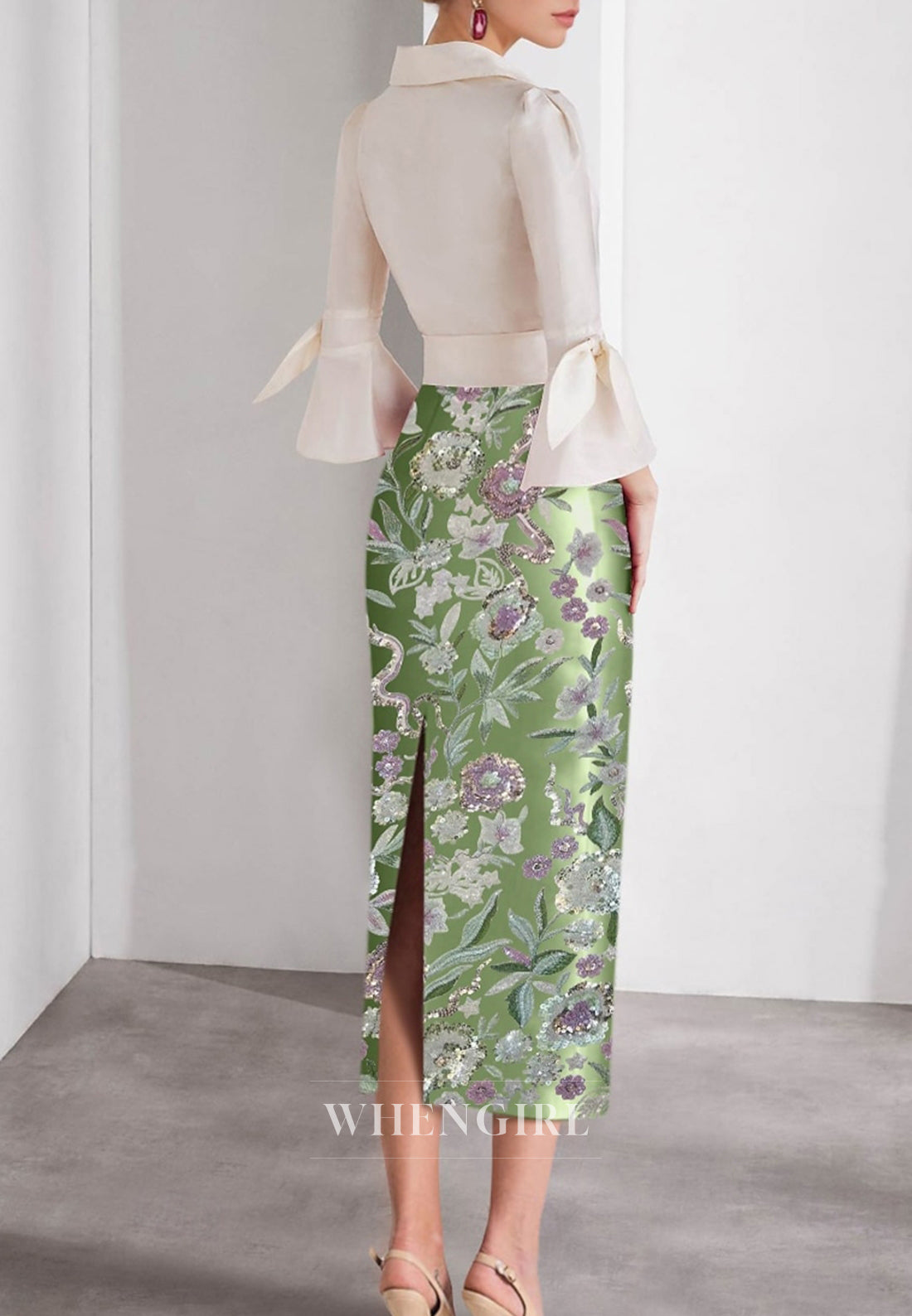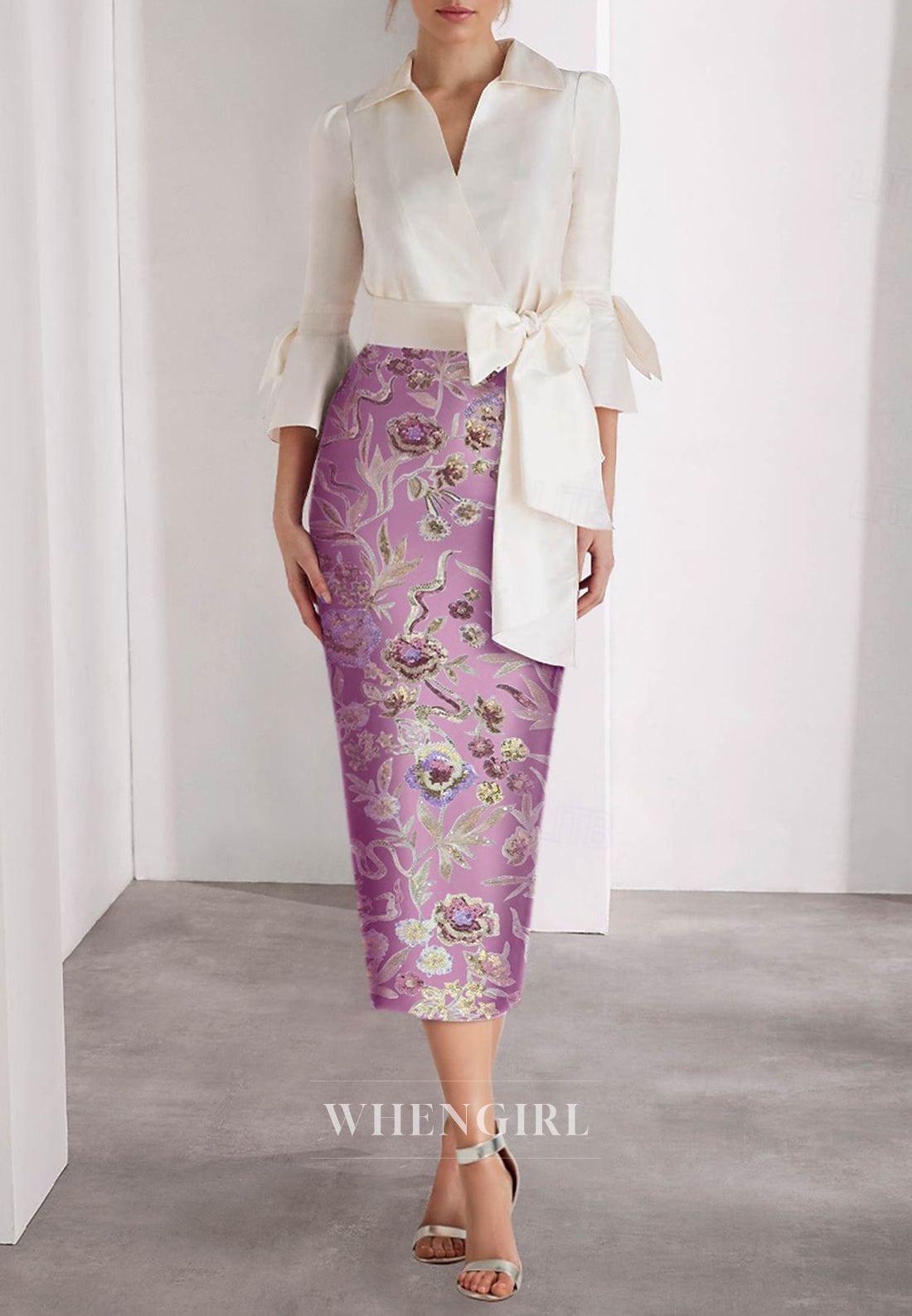Sheath 3/4 Sleeves Bowknot V Neck Tea Length Mother of the Bride Dress