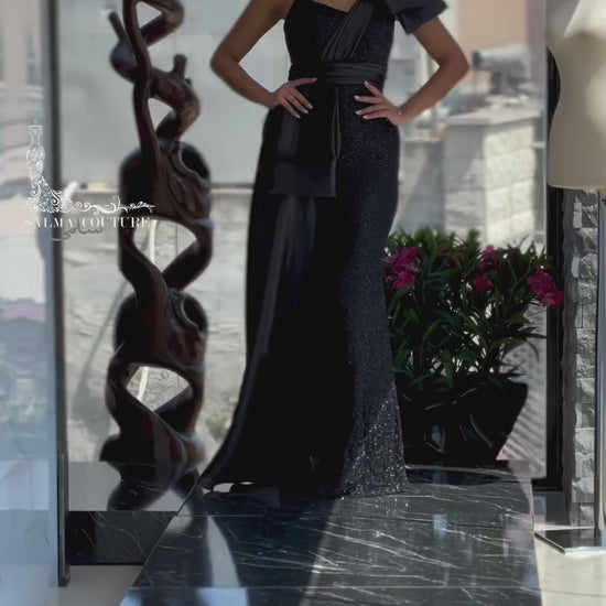 Feel absolutely stunning in this glamorous black sheath mother of the bride dress designed to celebrate your elegance and grace. The dramatic one-shoulder design creates a sophisticated, modern silhouette while the sleeveless cut offers comfortable, breathable coverage. Delicate beading adds shimmer and sophistication, creating a luminous look that catches the light beautifully. A charming bowknot detail provides a sweet, personal touch that shows thoughtfulness in every element. The floor-length silhouette delivers timeless formality and presence, creating a striking, confident look. This dress empowers you to feel absolutely radiant and cherished—allowing you to celebrate your important role with style and poise while looking your very best throughout