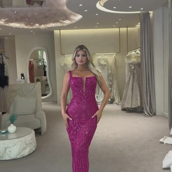 Make a bold statement in this vibrant fuchsia formal prom dress, featuring a flattering V neckline that elongates and complements your silhouette. Supportive regular straps provide comfort and security while maintaining a classic, refined aesthetic. Luxurious full rhinestone and beading embellishment covers the entire gown, creating an absolutely dazzling effect that sparkles with every movement. The comprehensive beadwork ensures maximum glamour and visual impact, perfect for those seeking a show-stopping entrance. The striking fuchsia hue radiates confidence and energy, making this dress ideal for prom, formal galas, and upscale celebrations. The expertly applied rhinestones catch light beautifully, guaranteeing you'll command attention and admiration. This meticulously crafted gown combines bold color with luxurious embellishment, ensuring you'll feel absolutely radiant and unforgettable all evening.