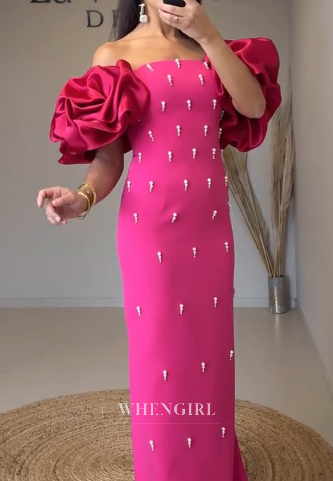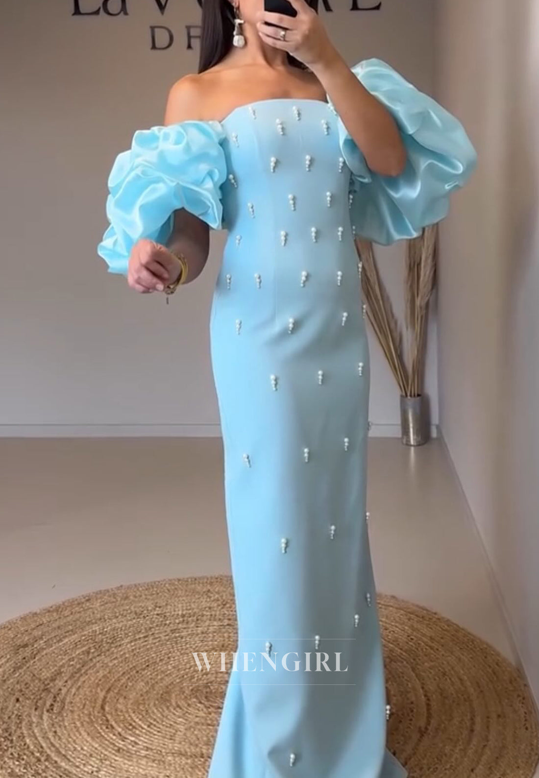 Sheath Off Shoulder Short Puff Sleeves Beaded Pearls Long Evening Formal Dress