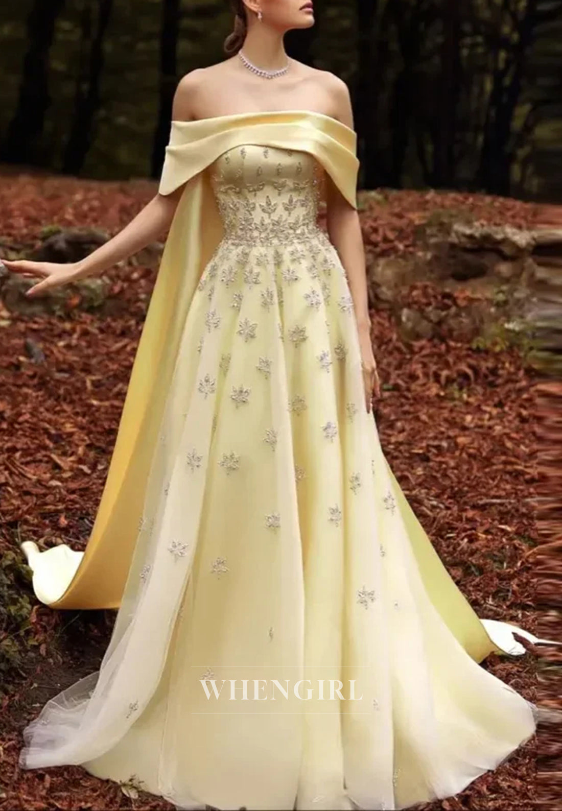 Off Shoulder Beaded Pleated Back Zipper A-Line Formal Evening Gown with Train