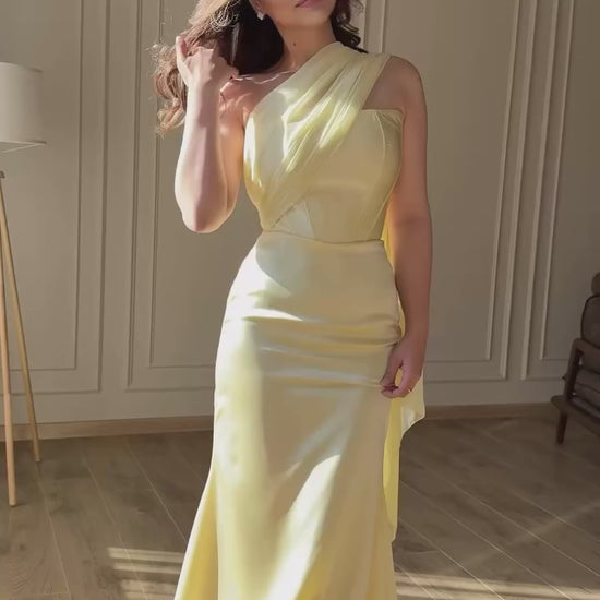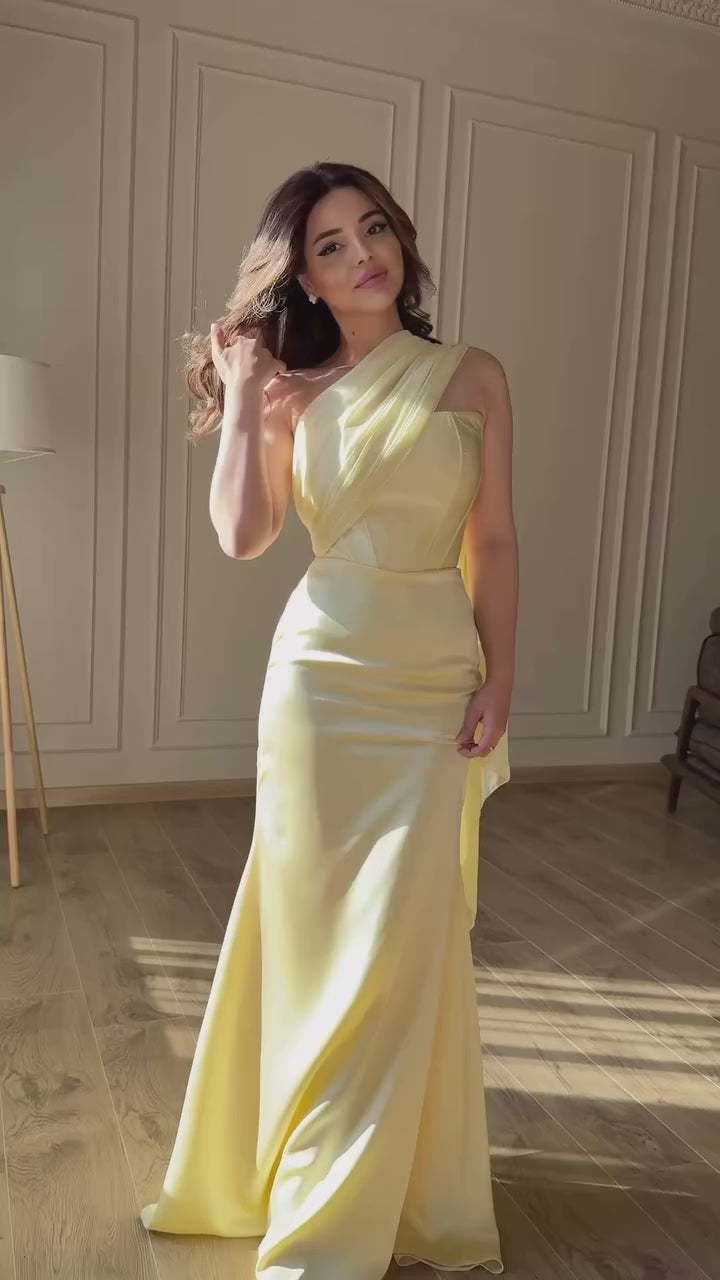Make an unforgettable entrance in this vibrant yellow gown that radiates confidence and charisma. The asymmetrical one-shoulder design creates an arresting silhouette that's both modern and daring, while the sleeveless cut showcases your shoulders with bold sophistication. The floor-length sheath hugs your form with precision, creating a striking vertical line that elongates and empowers. This is the dress for those unafraid to stand out—a fearless statement piece that transforms any formal event into your personal runway.
