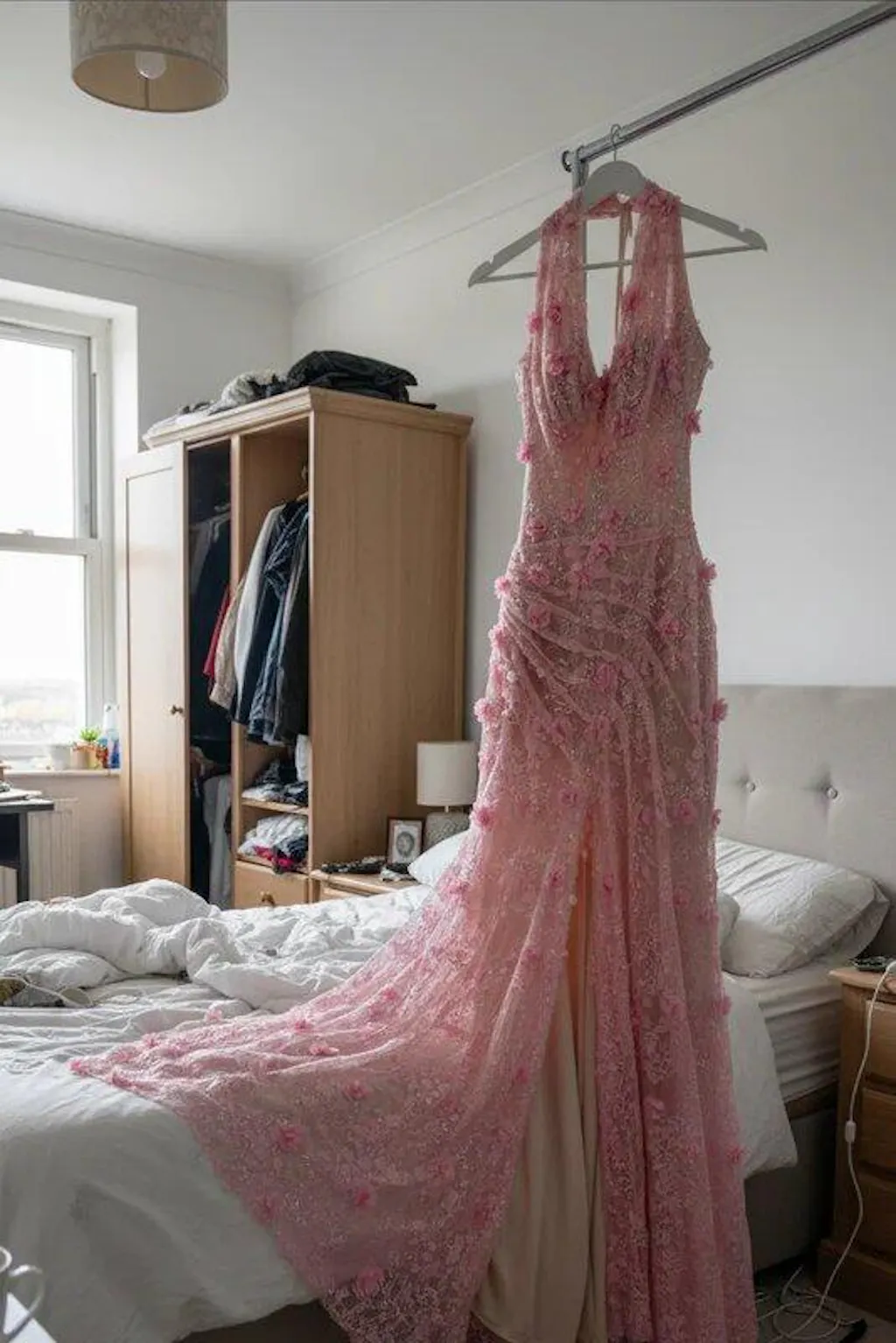 Turn heads at your next special event in this stunning sheath gown that's equal parts elegance and edge. The halter neckline frames your shoulders beautifully while delicate floral details add romantic flair. Sleek and form-fitting through the bodice, the ruched detailing creates gorgeous dimension, and that daring side slit? Pure showstopper energy. Perfect for prom, galas, or any night you want to feel absolutely fabulous. This dress doesn't whisper—it commands attention.