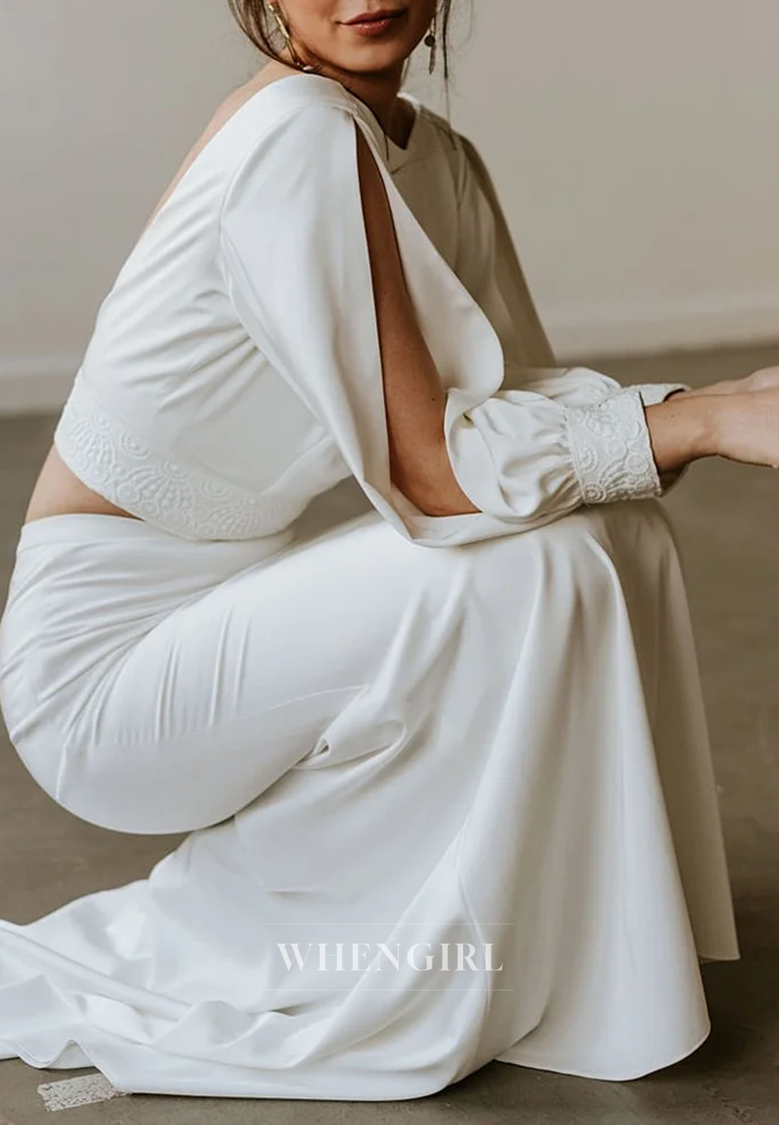 Sheath Simple Bateau Neck Cut Out Long Sleeves Two Pieces V Back with Sweep Train