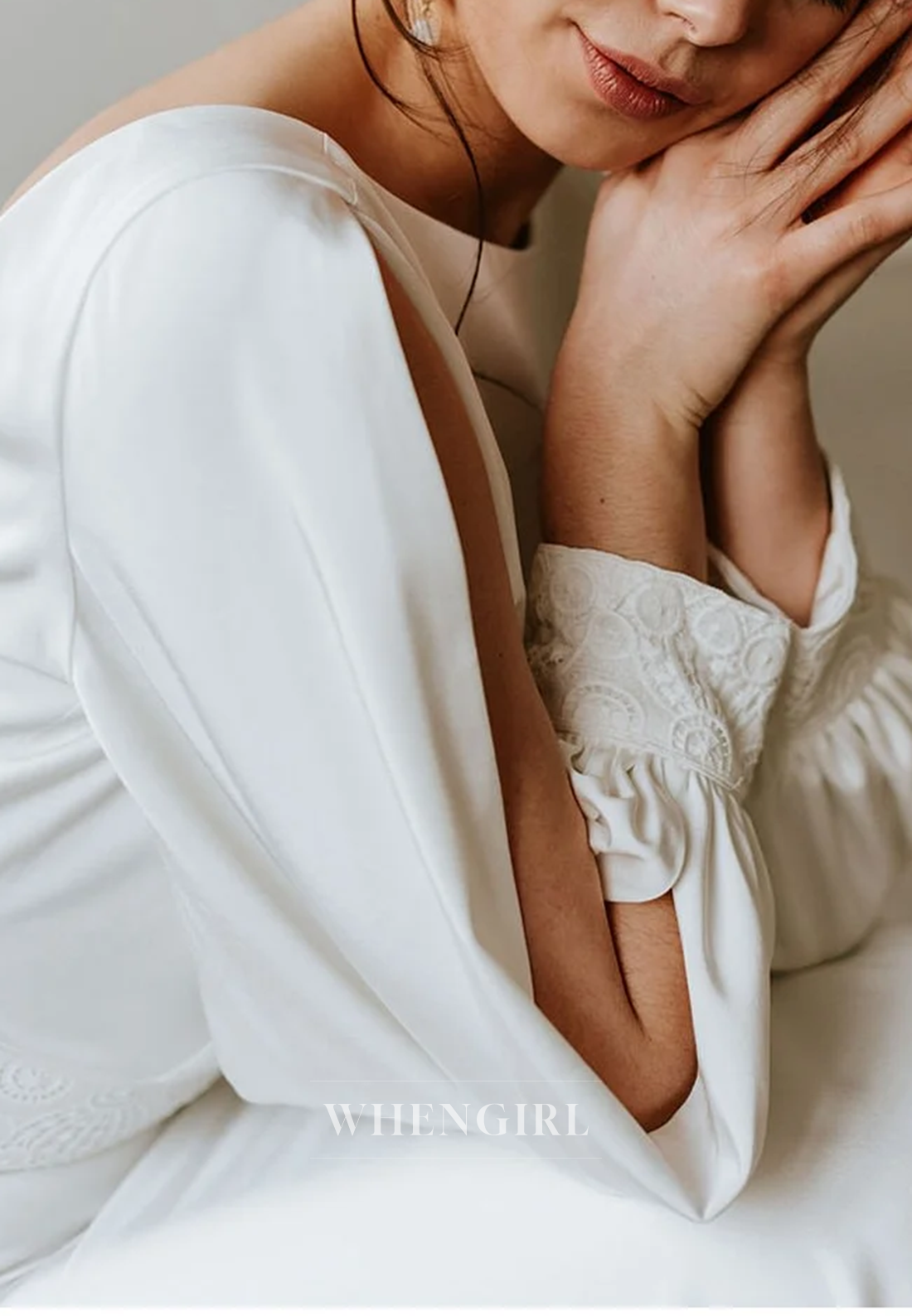 This sophisticated two-piece sheath wedding dress features a simple bateau neckline and long sleeves with elegant cut-out details. The deep V-back enhances its modern appeal, while the sweep train adds a touch of graceful movement, making it ideal for brides who appreciate refined, contemporary design.