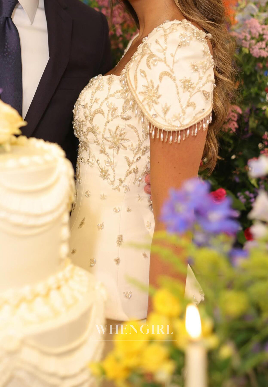 This elegant sheath wedding dress showcases a sweetheart neckline and delicate short sleeves for a timeless appeal. The intricately beaded back adds a touch of sophistication, while the concealed zipper ensures a seamless fit. Designed for grace and style, this long gown makes a refined statement for your special day.