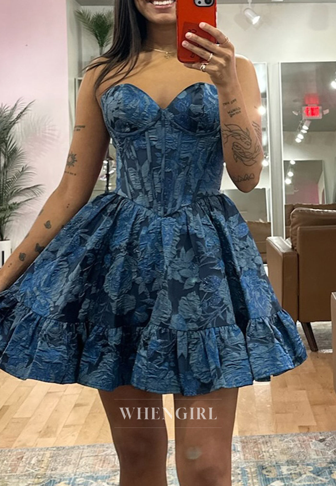 This A-line homecoming dress features a charming sweetheart neckline and a sleeveless, strapless design that highlights your shoulders and neckline. The short length and floral print add a playful, youthful touch, while the flattering silhouette ensures comfort and confidence throughout your celebration. Perfect for making memorable moments with style and ease.