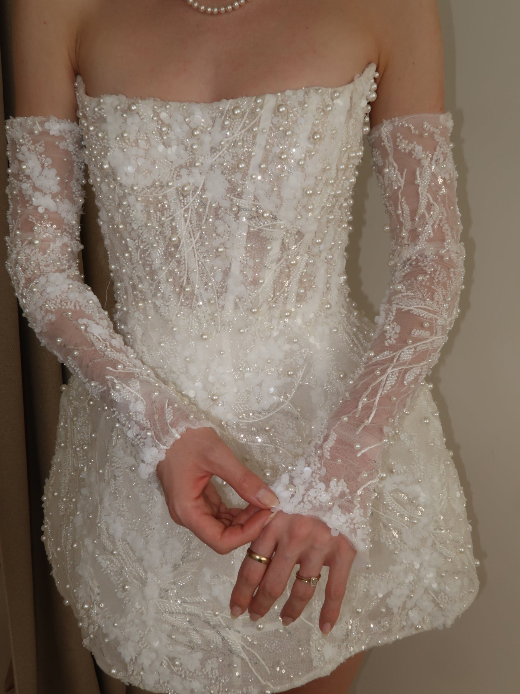 Twirl into your big moment in this show-stopping ball gown that breaks all the rules—strapless elegance meets dramatic long sleeves for a look that's totally unexpected. Intricate beading catches the light as you move, while the short silhouette keeps things fun and flirty. Perfect for brides who want to dance the night away without sacrificing glamour. This dress proves you don't need traditional to be absolutely stunning.