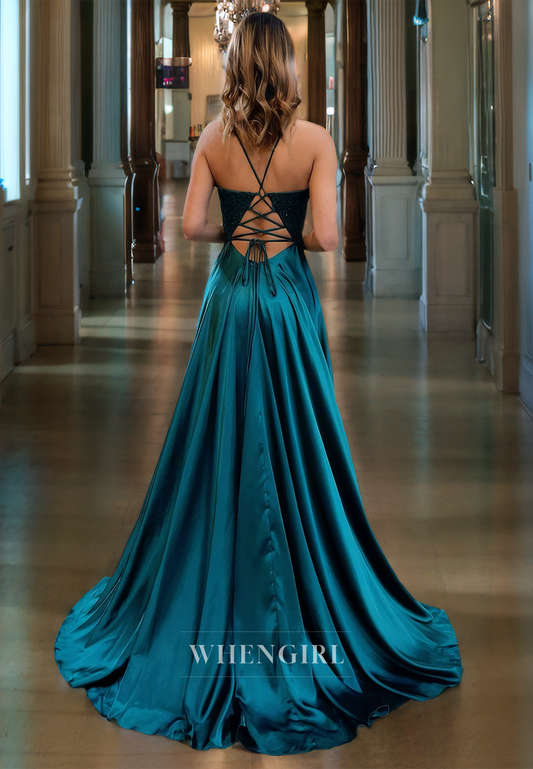 A-Line V Neck Straps Sleeveless Appliques Long Prom Dress with High Side Slit and Train