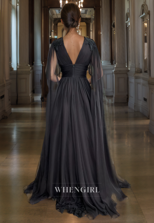 A-Line V Neck Sleeveless Pleated Beaded Buttons V Back Long Prom Dress with High SIde Slit