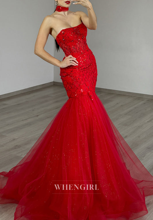 Red Strapless Beaded Sleeveless Prom Dress Tulle Mermaid Evening Gown