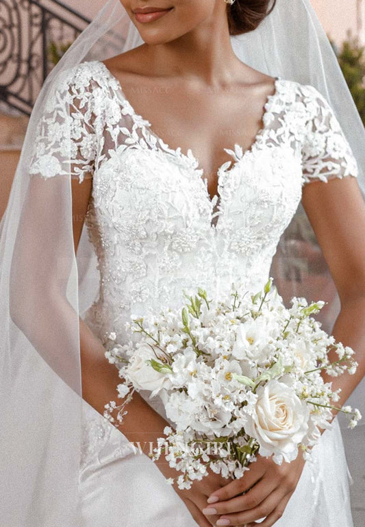 V Neck Short Sleeves Court Train Mermaid Wedding Dress with Appliques Lace