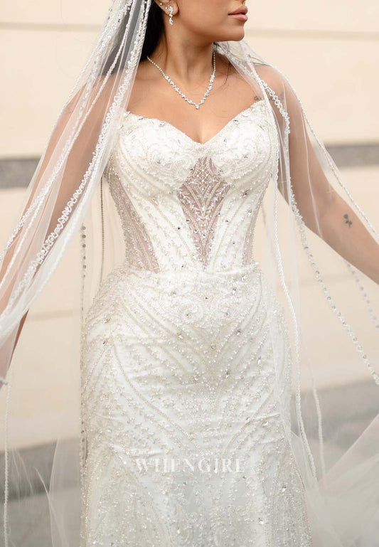 V Neck Pearls Beading Sleeveless Removable Train Long Wedding Dress