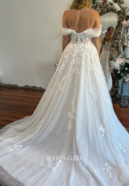 V Neck Off Shoulder Appliqued Lace A-Line Sweep Train Wedding Dress