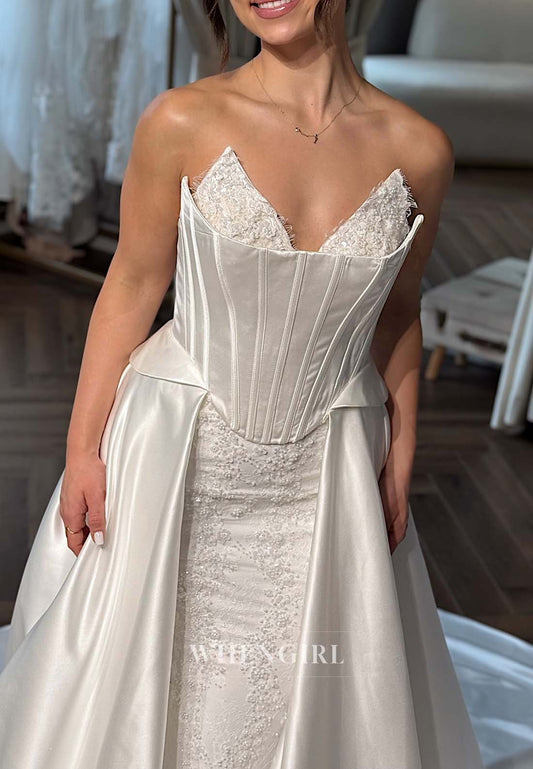 V Neck Long Sleeves Appliqued Back Zipper Strapless Mermaid Wedding Dress with Court Train