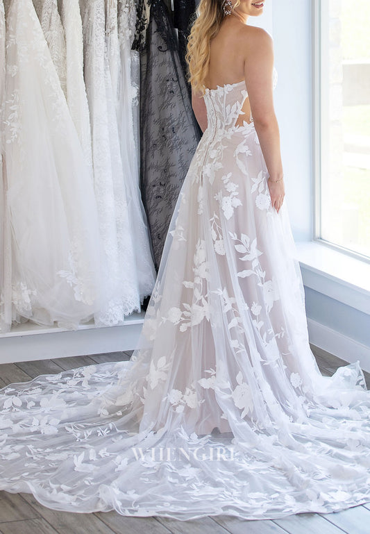 V Neck Sleeveless Appliqued Strapless Court Trian A-Line Wedding Dress