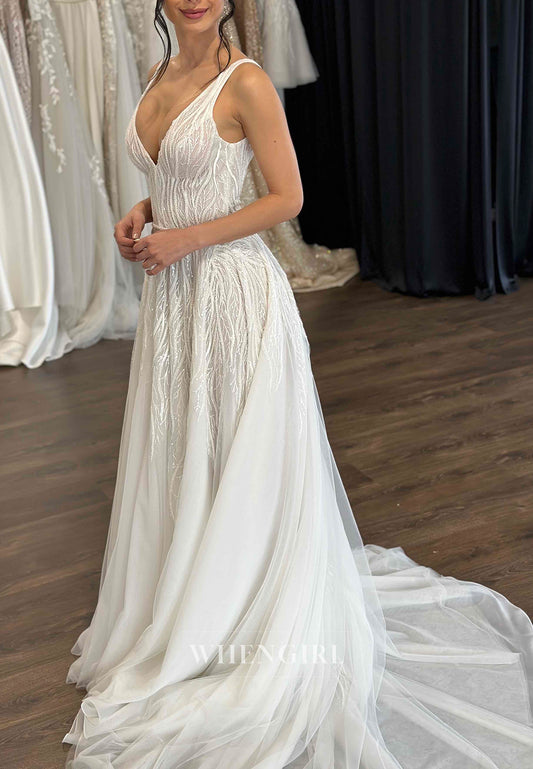 V Neck Sleeveelss Beaded Straps Vine Sweep Train A-Line Wedding Dress