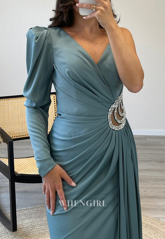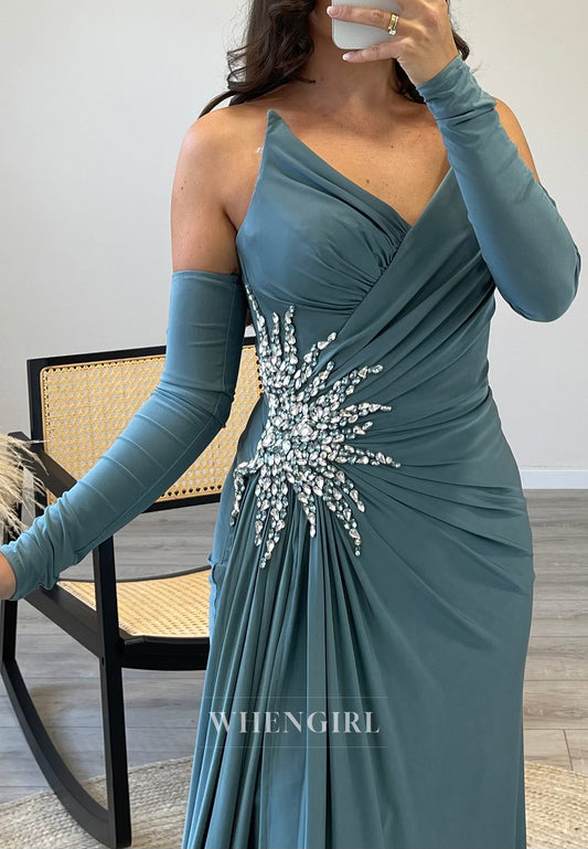 V Neck Rhinestone Pleated Formal Dress Long Sleeves Side Slit Train Evening Gown