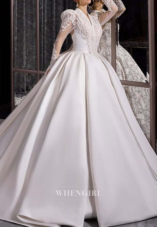 V Neck Long Sleeves Appliqued Lace A-Line Satin Court Train Wedding Dress