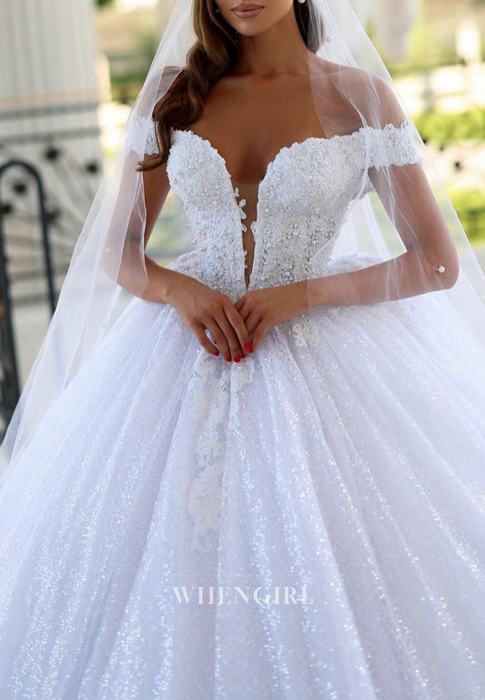 V Neck Off Shoulder Appliqued Beads A-Line Sequins Wedding Dress
