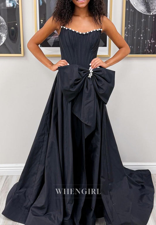Black A-Line Bowknot Beaded Neckline Sleeveless Prom Dress