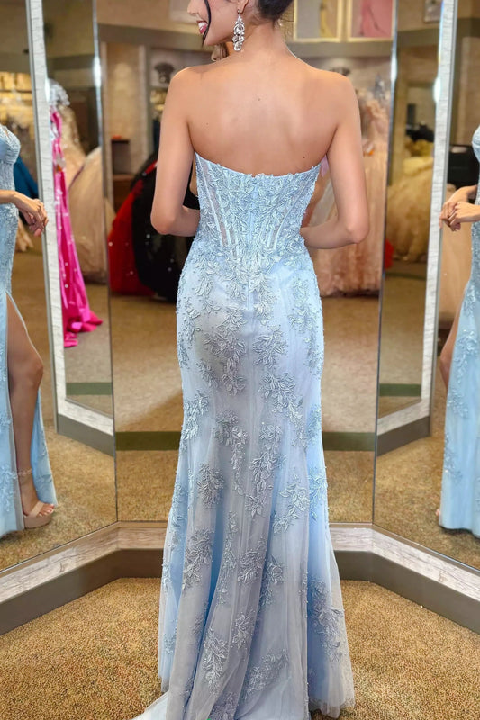 Blue Strapless Ruffles Lace Appliques High Slit Sleeveless Long Prom Dress