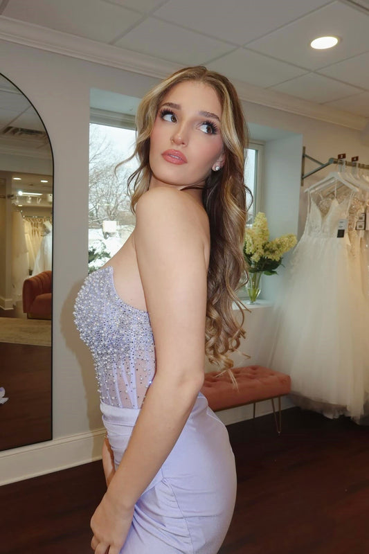Silver Side Slit V-Neck Tie Back Prom Dress A-Line Beaded Strapless Tulle Evening Gown