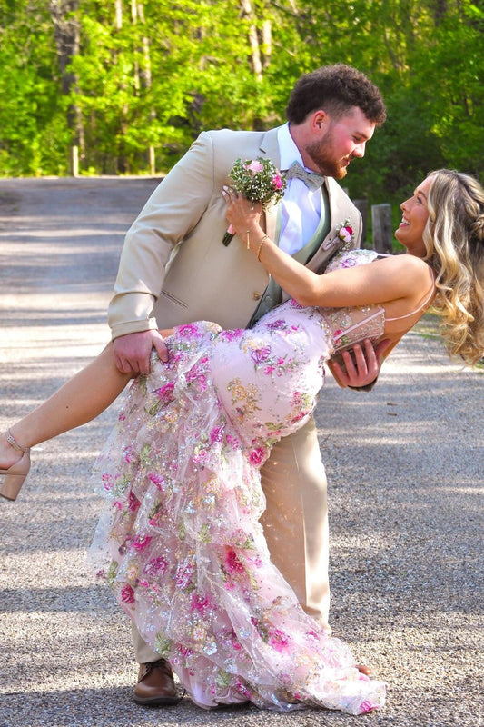 Straps Light Pink 3D Floral Tiered Long Dress with Slit