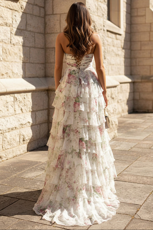 A-Line Strapless Empire-Waist Print Ruffles Long Prom Dress with Slit