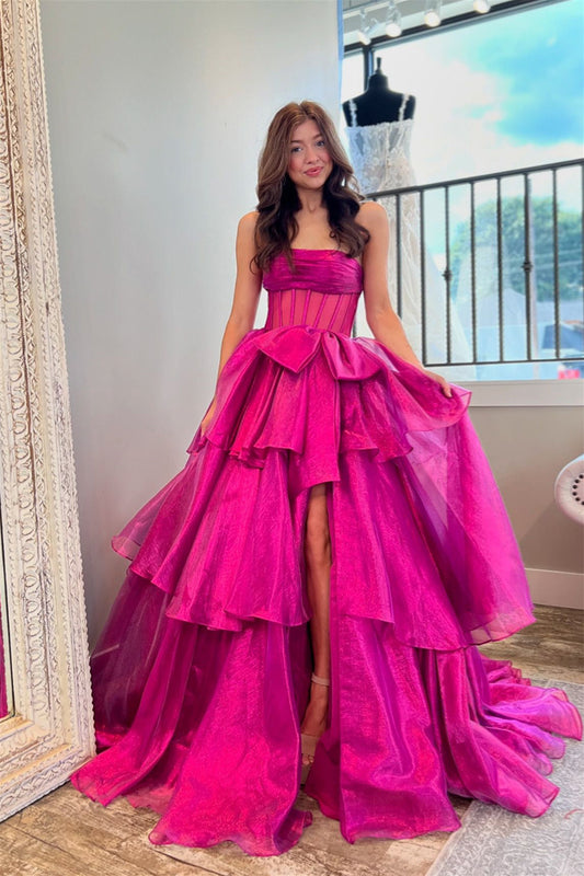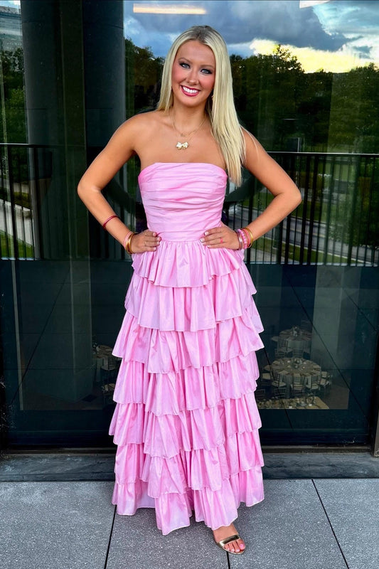 Strapless Pink Pleated Tiered Long Dress with Slit