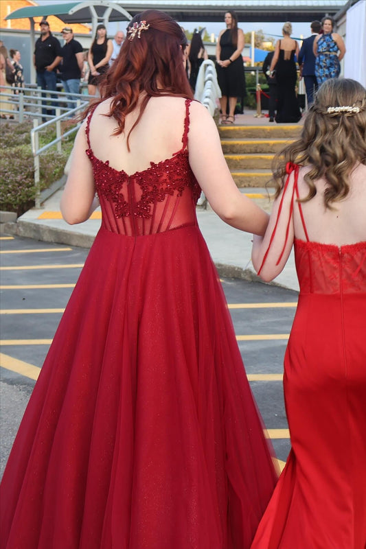 Straps Wine Red Appliques Sparkle A-line Long Dress