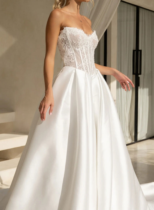A-Line Strapless Sleeveless Chapel Train Matte Satin Wedding Dresses With Pockets