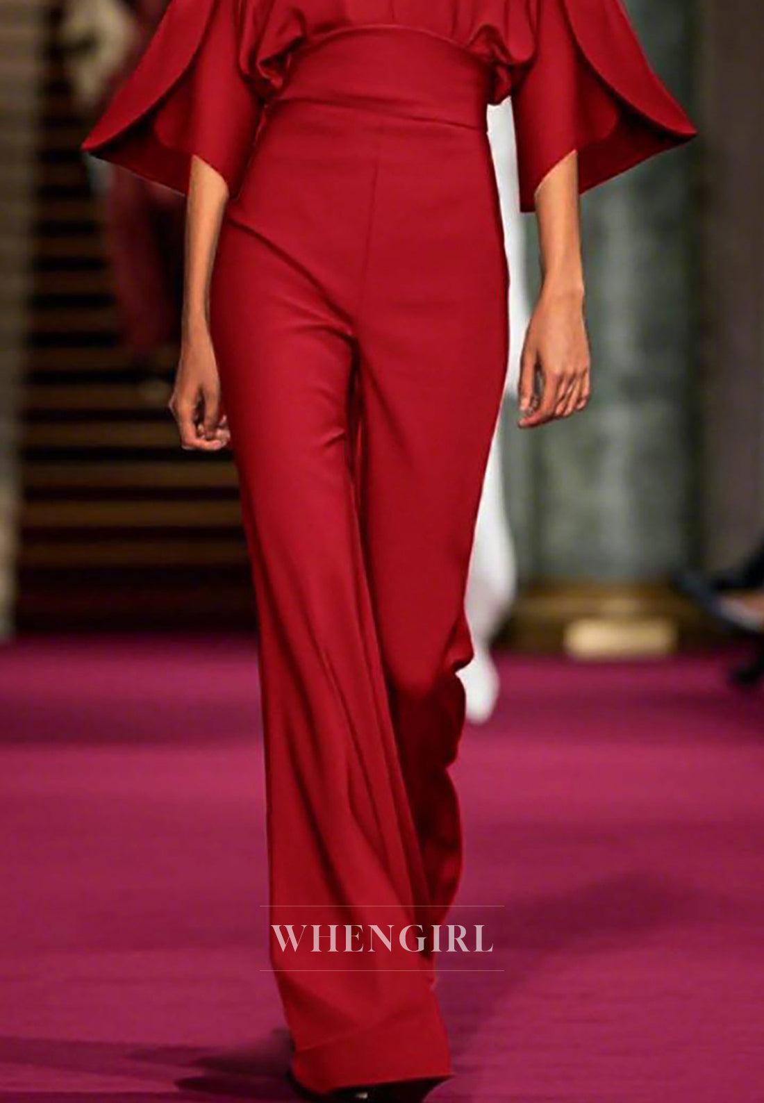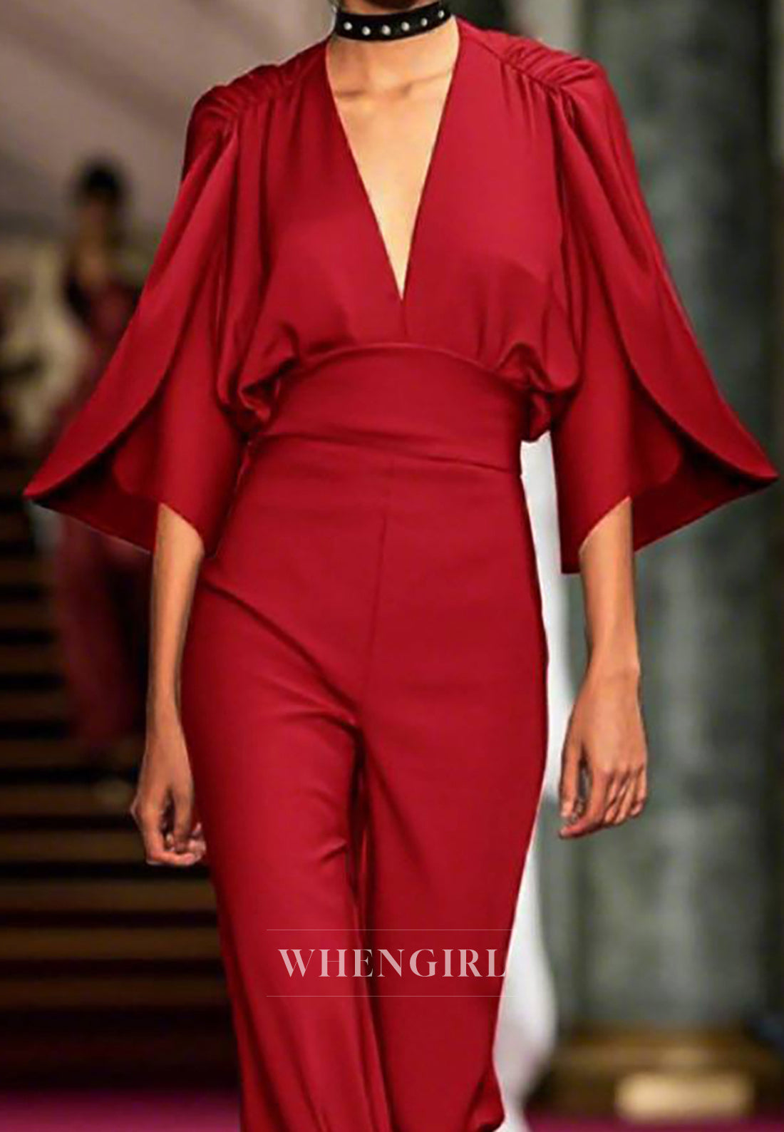 Evening Party Jumpsuit Bell Sleeves Deep V Neck Sheath Satin Jumpsuit x 1;